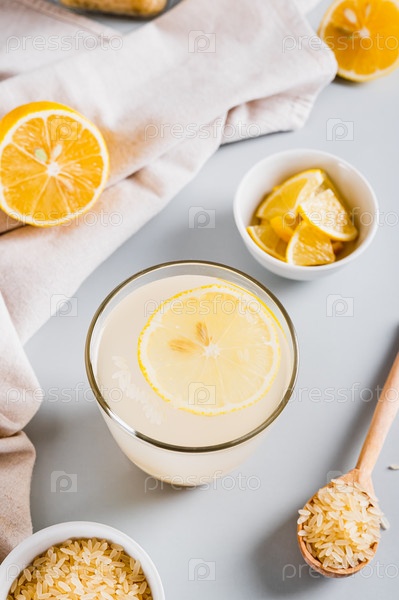 Модный рисово-лимонный напиток для снижения аппетита в стакане на столе вертикальный вид