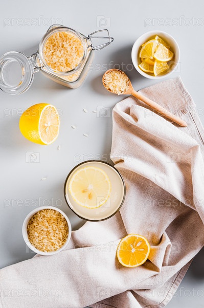 Модный рисово-лимонный напиток для снижения аппетита в стакане на столешнице и вертикальном виде