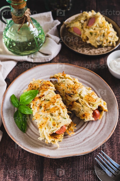 Голубцы с сосисками на тарелке на столе вертикальный вид