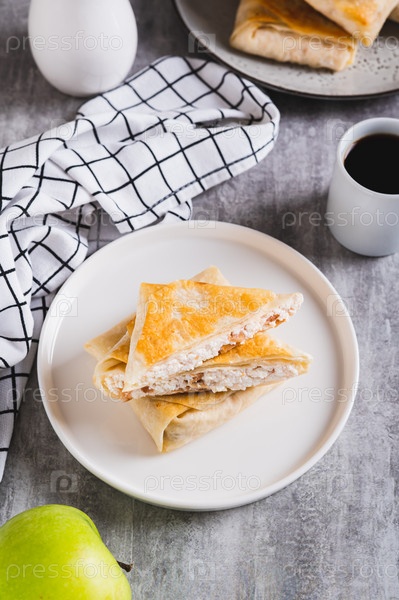 Творог и яблоко, завернутые в жареный лаваш на тарелке на столе вертикальный вид