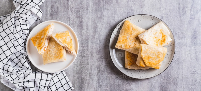 Творог и яблоко, завернутые в жареный лаваш на тарелке на столешнице веб-баннер