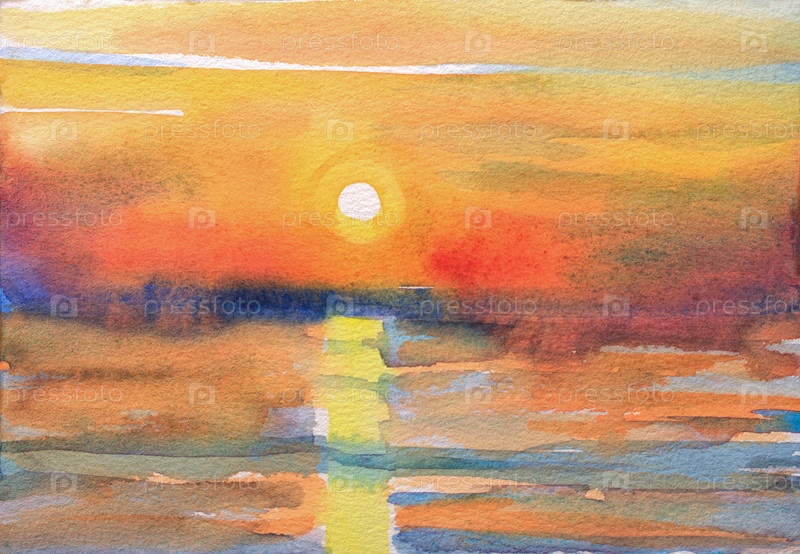 Красочный морской пейзаж на закате. Второй этап. Набор эскизов сцен морских закатов. Акварельная иллюстрация в технике аля прима