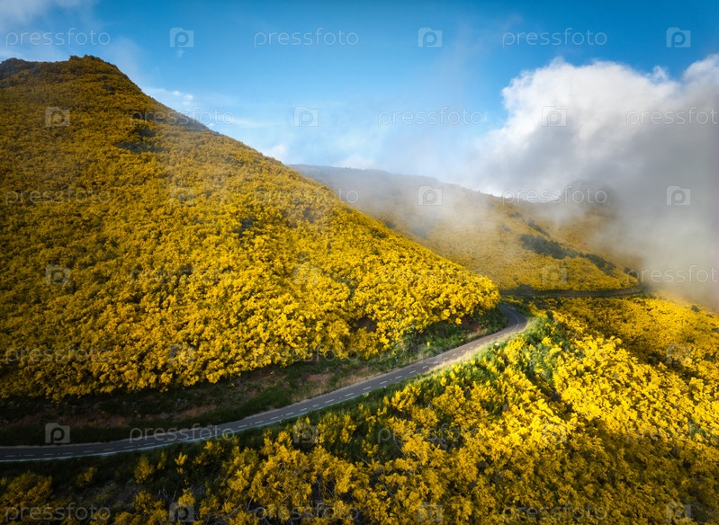Вид с воздуха на дорогу среди цветущих кустарников Cytisus возле Пику-ду-Арейро, Португалия