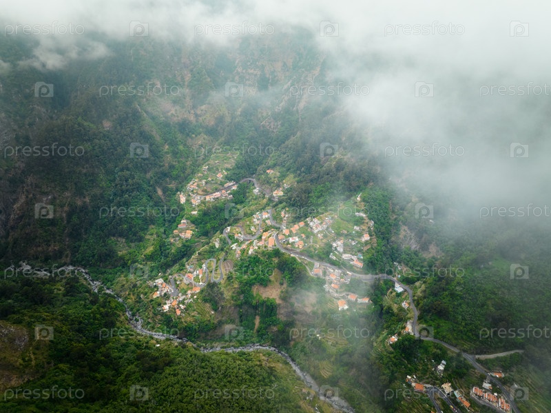 Вид с воздуха на деревню Куррал-дас-Фрейрас. Мирадуру-да-Эйра-ду-Серрадо, Мадейра, Португалия