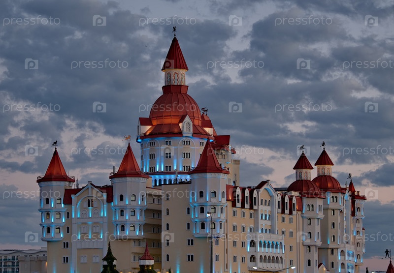 Россия, Сочи. Октябрь 08, 2024. Вид на разноцветную вечернюю иллюминацию креативного отеля Богатырь возле Олимпийского парка