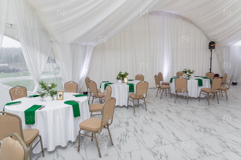 Фужеры, серебряные приборы и зеленые салфетки на круглых столах, покрытых белой скатертью