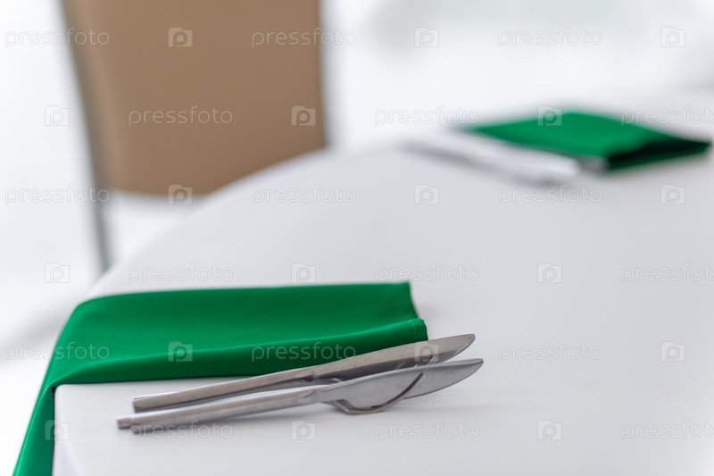 Крупный план бокалов для вина, серебряных столовых приборов и зеленых салфеток на круглых столах, покрытых белой скатертью