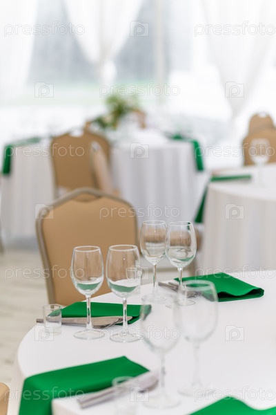 Крупный план бокалов для вина, серебряных столовых приборов и зеленых салфеток на круглых столах, покрытых белой скатертью
