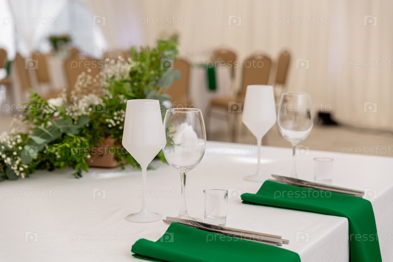 Крупный план бокалов для вина, серебряных столовых приборов и зеленых салфеток на круглых столах, покрытых белой скатертью. Концепция кейтеринга. Интерьер шатра для свадебного ужина, готов для гостей