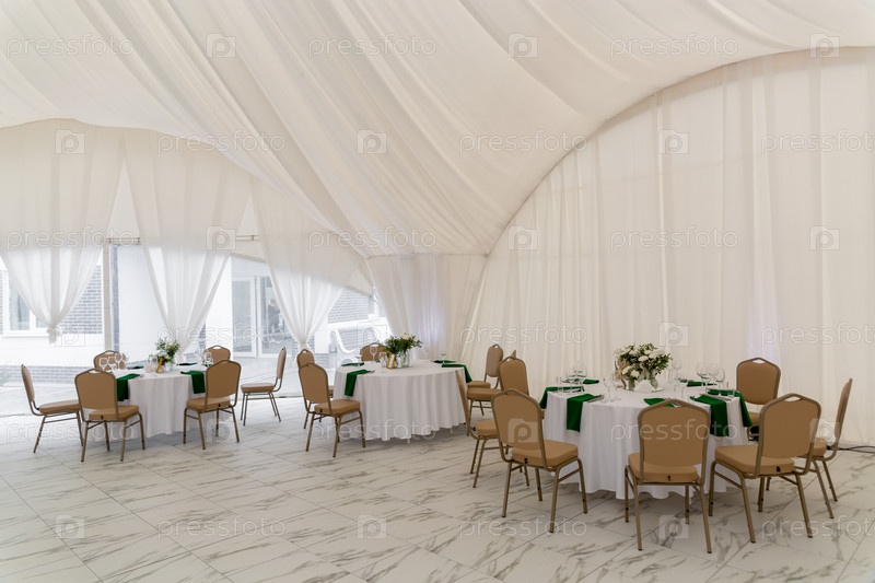 Фужеры, серебряные приборы и зеленые салфетки на круглых столах, покрытых белой скатертью