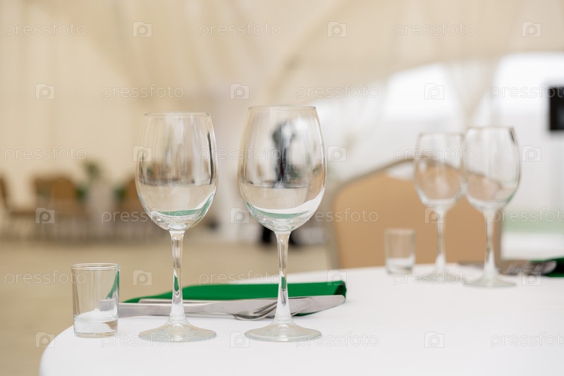Крупный план бокалов для вина, серебряных столовых приборов и зеленых салфеток на круглых столах, покрытых белой скатертью