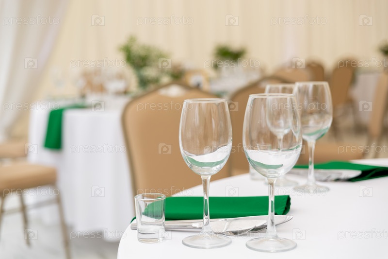 Крупный план бокалов для вина, серебряных столовых приборов и зеленых салфеток на круглых столах, покрытых белой скатертью