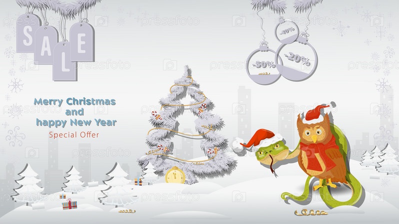 Специальное предложение Рождественская и новогодняя распродажа Шапка Санта-Клауса со змеей и совой рядом с елкой в зимнем заснеженном лесу