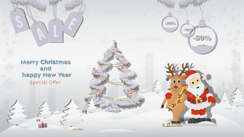 Специальное предложение Рождественская и новогодняя распродажа Санта-Клаус, олени обнимаются рядом с елью в зимнем заснеженном лесу