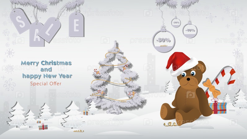 Специальное предложение на Рождество и Новый год: игрушка-медведь в шапке Санта-Клауса рядом с елкой в зимнем заснеженном лесу