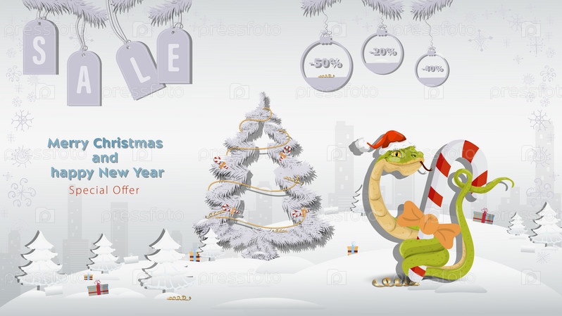 Специальное предложение Рождественская и новогодняя распродажа Змея в шапке Санта-Клауса обвивает конфету рядом с елкой в зимнем заснеженном лесу
