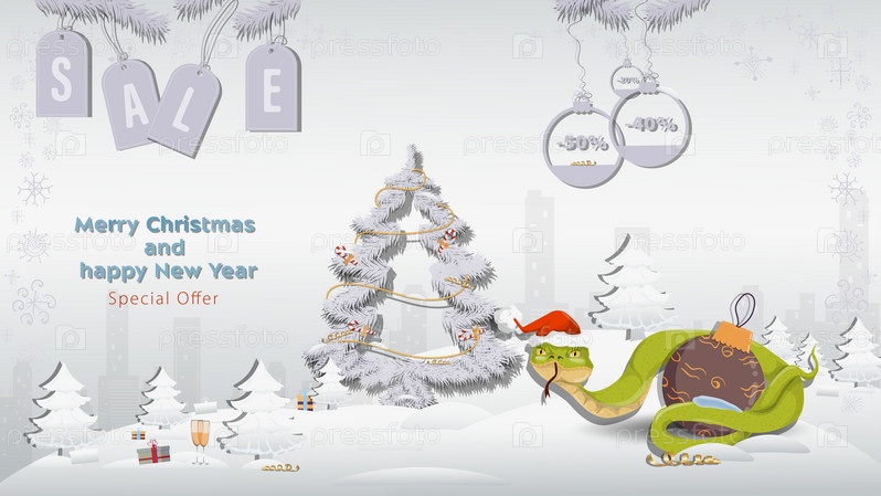 Специальное предложение Рождественская и новогодняя распродажа Змея в шапке Санта-Клауса обвивает елочную игрушку рядом с елью в зимнем заснеженном лесу