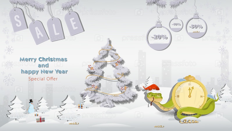 Специальное предложение Рождественская и новогодняя распродажа Змея в шапке Санта-Клауса обвивает часы рядом с елью в зимнем заснеженном лесу