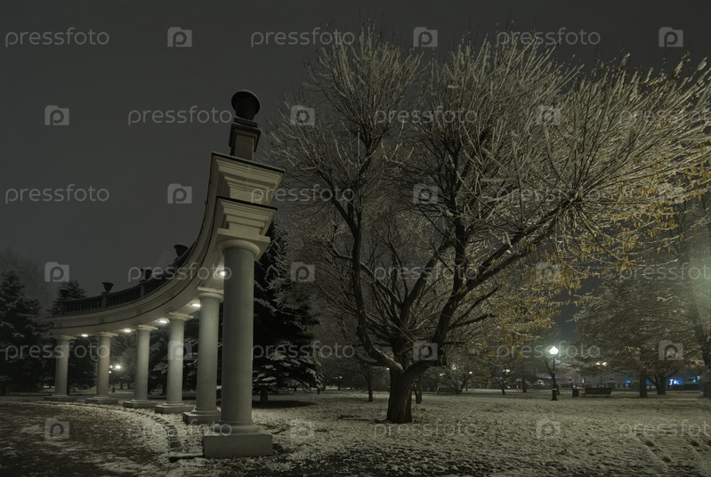 Новокузнецк, Россия. 01 ноября 2024 года. Колоннада вокруг центрального фонтана городского парка имени Юрия Гагарина, покрытые первым осенним снегом и подсвеченные фонарями холодного света