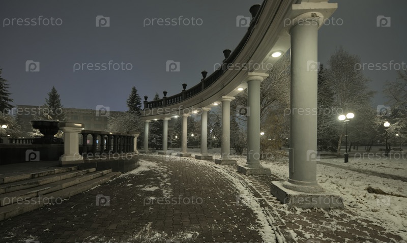 Новокузнецк, Россия. 01 ноября 2024 года. Колоннада вокруг центрального фонтана городского парка имени Юрия Гагарина, покрытые первым осенним снегом и подсвеченные фонарями холодного света