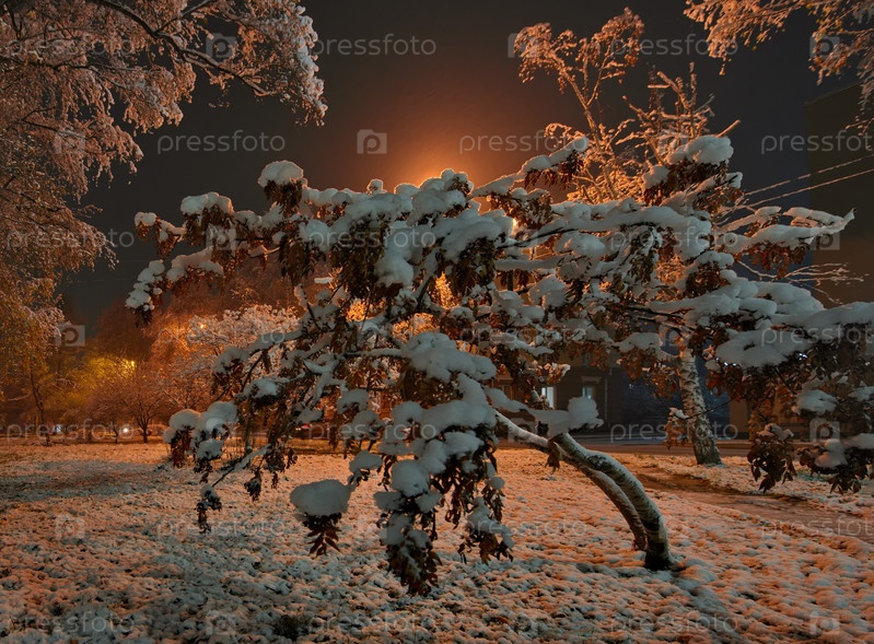 Ночной парк в осеннем снегу