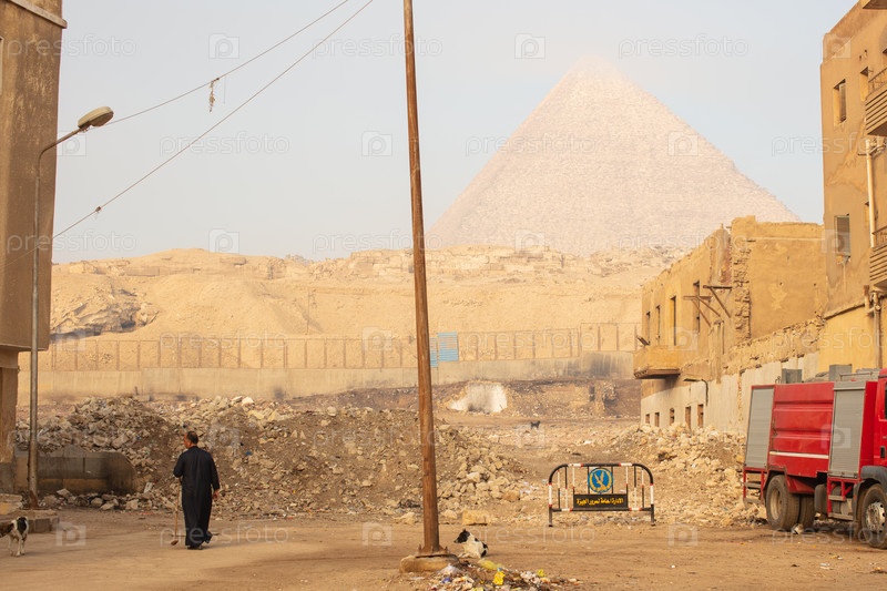 Вид со стороны трущоб на египетские пирамиды в Гизе