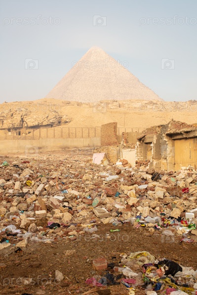 Вид со стороны трущоб на египетские пирамиды в Гизе
