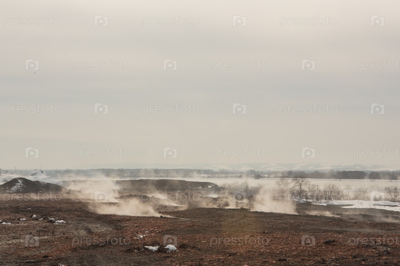 Дым на шлаковой свалке, загрязнение