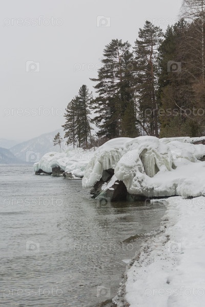 Незамерзающее Телецкое озеро зимой. Россия Алтайский край