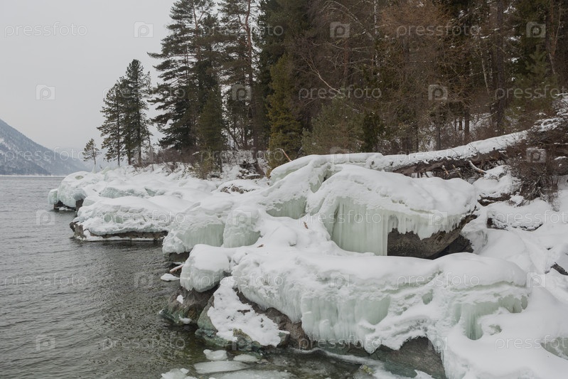 Незамерзающее Телецкое озеро зимой. Россия Алтайский край