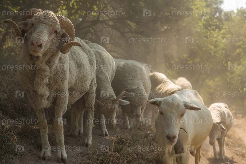 Овечье лицо. Разведение животных, стадо овец идет на пастбище на лугу