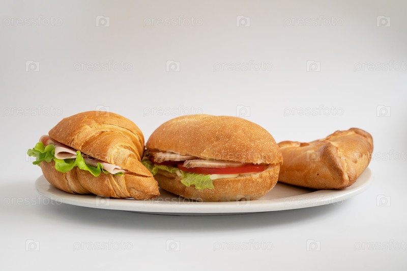 Тарелка с двумя сэндвичами с круассанами, одним сэндвичем с багетом и пикантной выпечкой. Идеально подходит для легкого обеда или перекуса