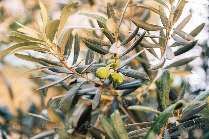 Крупный план зеленых оливок на ветке оливкового дерева