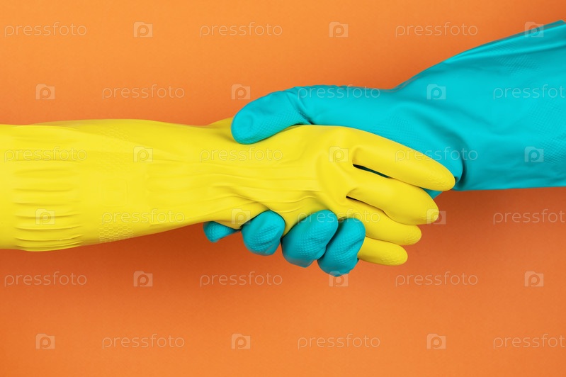 Рукопожатие в резиновых перчатках на оранжевом фоне