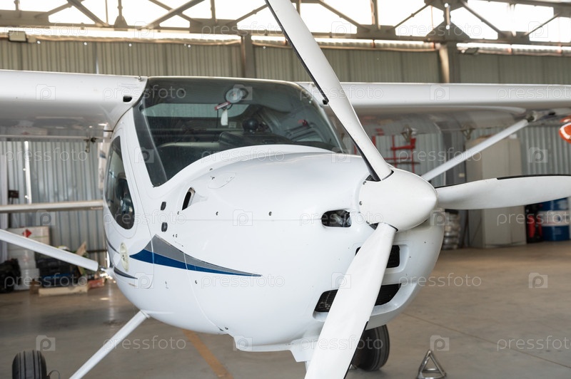 Маленький частный легкий винтовой самолет в ангаре, фотография крупным планом