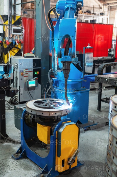 Автоматический промышленный сварочный робот на современном заводе в эксплуатации