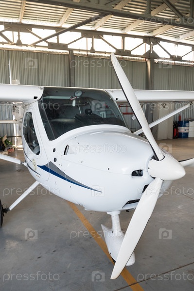 Маленький белый самолет припаркован в ангаре