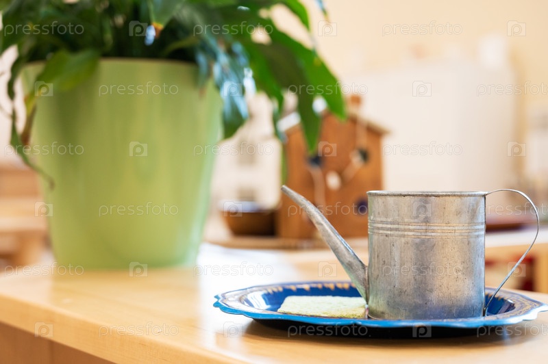 Винтажная лейка и растение в горшке в помещении