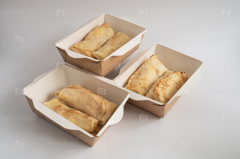 Три коробки с едой на вынос, заполненные аккуратно сложенными блинами, готовыми к доставке или употреблению на вынос, сфотографированные на однотонном фоне