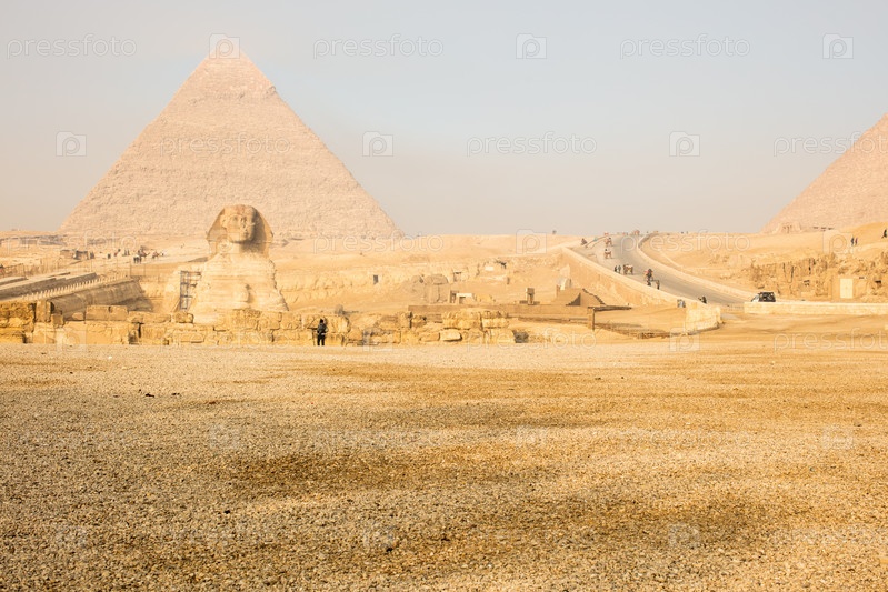 Пейзаж с египетскими пирамидами, Великим Сфинксом и силуэтами Древние символы и достопримечательности Египта для вашей концепции путешествия в Африку в золотом солнечном свете. Сфинкс в комплексе пирамид Гизы на закате