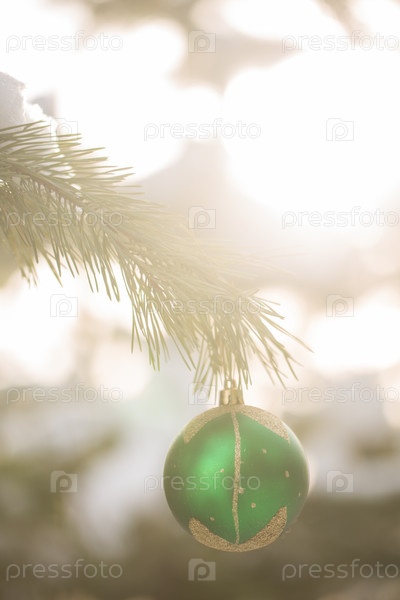 Зеленый рождественский шар висит на зимней елке