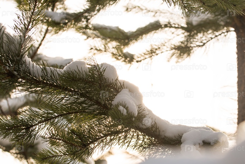 Заснеженные ветки елей в солнечную погоду, крупный план