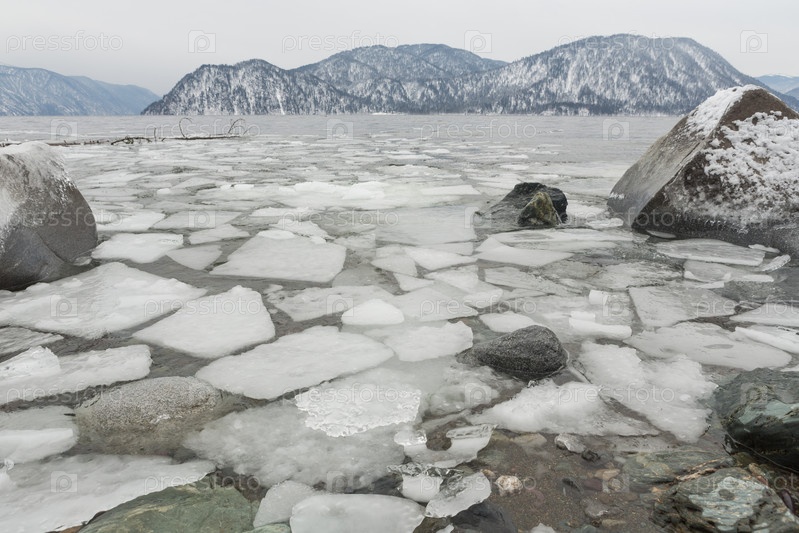 Незамерзающее Телецкое озеро зимой. Россия Алтайский край