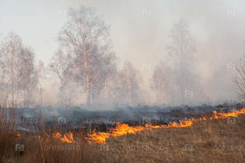 Лесной пожар горит, лесной пожар крупным планом в дневное время