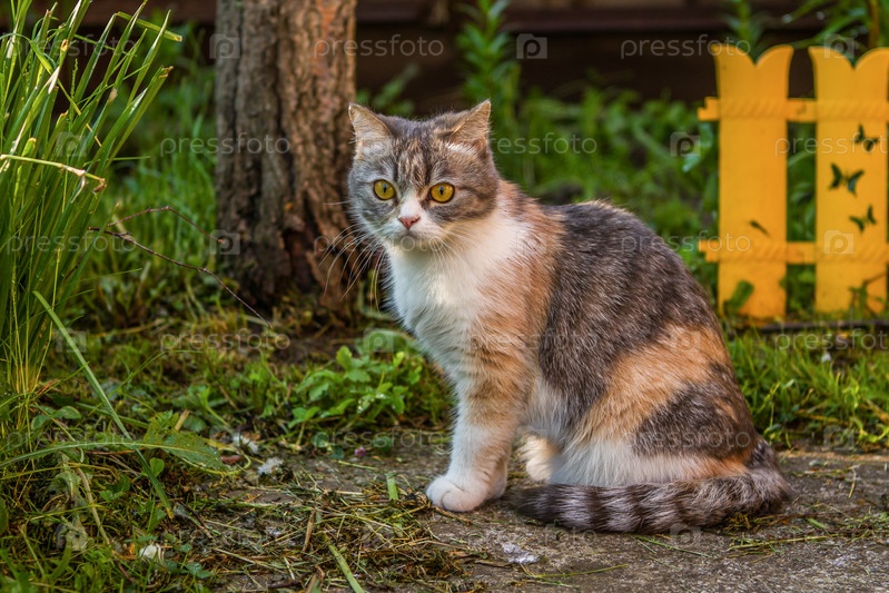 Трехцветный калико мейн-кун кот на улице в зеленом саду со множеством растений и кустов смотрит в камеру