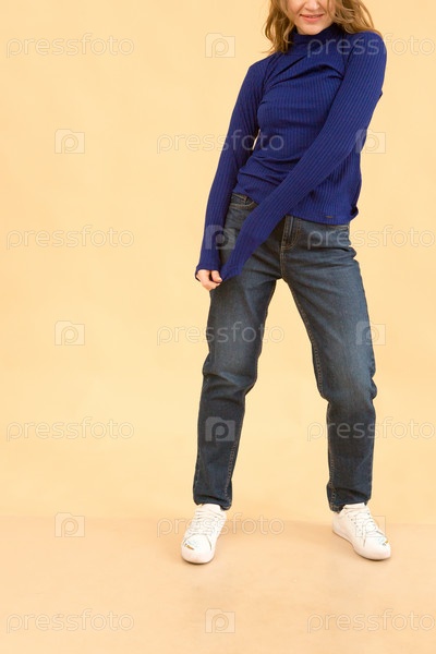 Женщина в одежде на заднем плане в студии, примеряет одежду