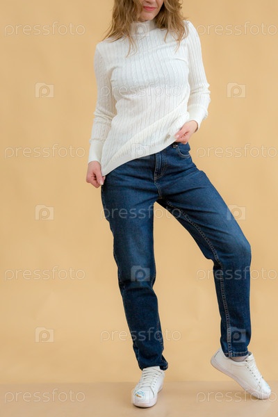 Женщина в одежде на заднем плане в студии, примеряет одежду