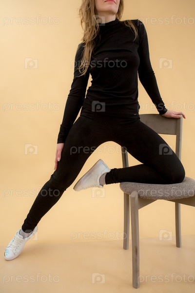 Женщина в одежде на заднем плане в студии, примеряет одежду