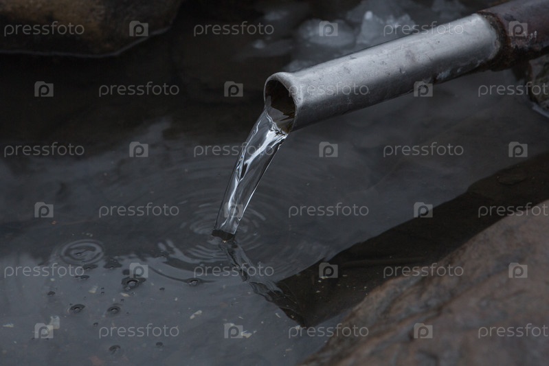 Природная родниковая вода, чистая вода течет по небольшой трубе