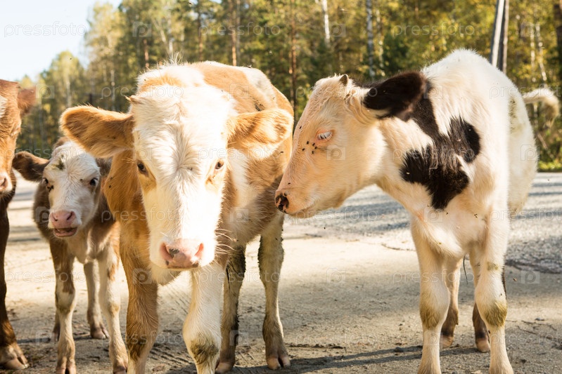 Маленький любопытный теленок идет по дороге
